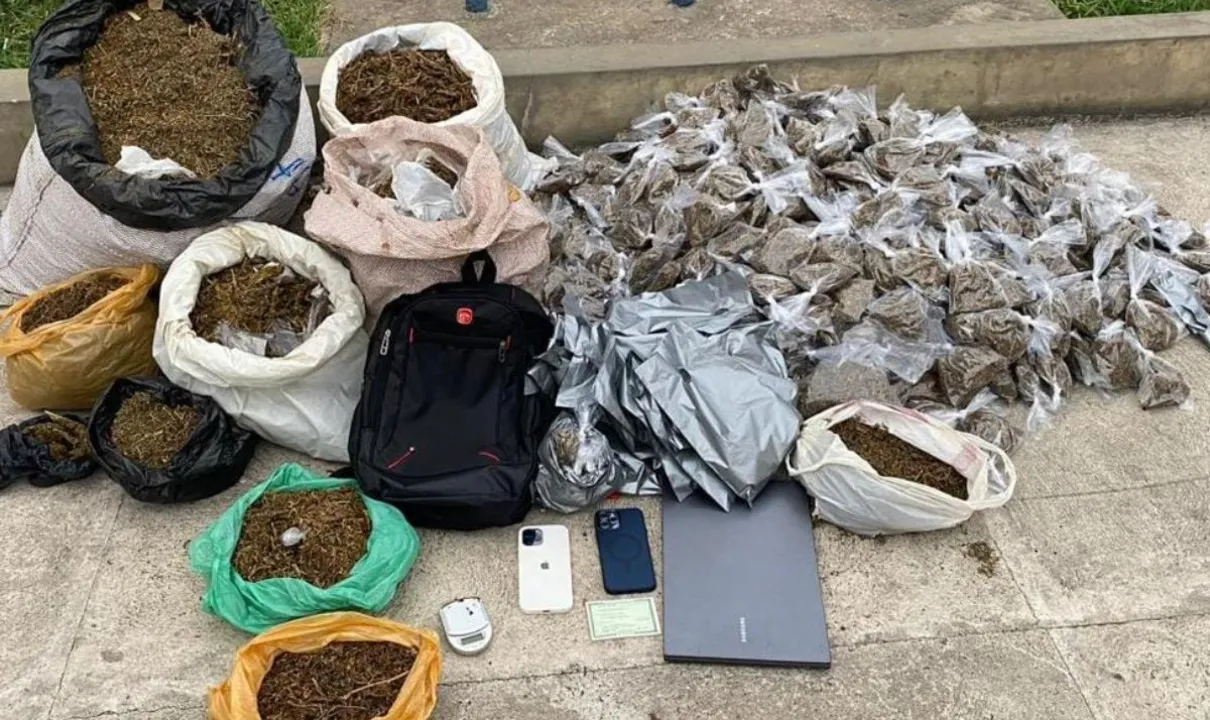 No local foram encontrados: quatro sacos grandes de alinhagem contendo substâncias aparentando ser maconha; uma mochila contendo 17 pacotes de substâncias aparentando ser maconha; um saco contendo 453 pacotes de substância aparentando ser maconha; dois celulares iphone; um notebook e uma balança de precisão.